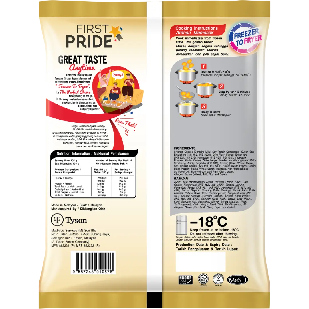 Nuget Tempura Ayam Berkeju Premium kami dibuat dengan dada ayam semulajadi yang berkualiti tinggi, diselaputi tempura dan berkeju di dalam. Sensasi lazat pada hidangan klasik ini menggabungkan ayam yang lembut bersama dengan keju cheddar berkrim untuk sensasi rasa yang tiada tandingannya!