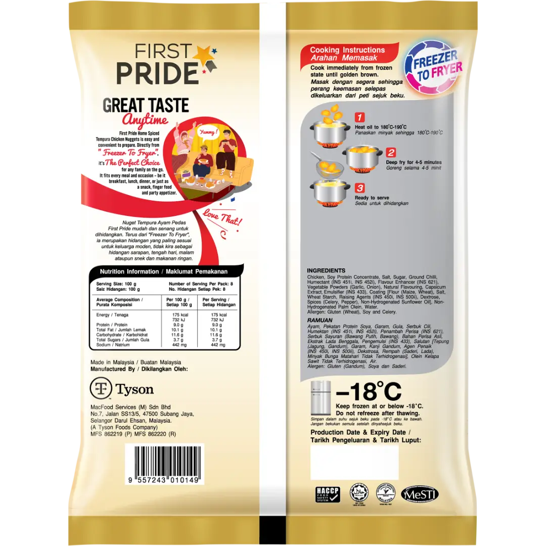 Ayam, Pekatan Protein Soya, Garam, Gula, Serbuk Cili, Humektan (INS 451i, INS 452i), Penambah Perisa (INS 621), Serbuk Sayuran (Bawang Putih, Bawang), Bahan Perisa Asli, Ekstrak Lada Benggala, Pengemulsi (INS 433), Salutan [Tepung (Jagung, Gandum), Garam, Kanji Gandum, Agen Penaik (INS 450i, INS 500ii), Dekstrosa, Rempah (Saderi, Lada), Minyak Bunga Matahari Tidak Terhidrogenasi], Olein Kelapa Sawit Tidak Terhidrogenasi, Air.