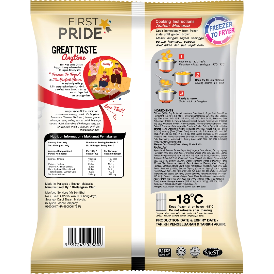 Ayam, Pekat Protein Soya, Pati Jagung, Gula, Garam, Tepung Jagung, Humektan (INS 451i, INS 452i), Penambah Perisa (INS 621, INS 635), Perasa (Pengemulsi (INS 451i, INS 452i, INS 450i, INS 341iii), Dekstrosa, Garam, Antioksidan (INS 316), Penambah Perisa (Ekstrak Yis), Pengawet (INS 250, INS 252), Serbuk Sayur-sayuran, Ekstrak Rempah-rempah), Perisa (Penambah Perisa (Ekstrak Yis), Dekstrosa, Garam), Serbuk Sayuran (Bawang Putih, Bawang Merah), Rempah-rempah, Pemendekan Sawit Tidak Terhidrogenasi, Pengatur Keasidan (INS 330), Perisa Asap Asli (0.01%), Salutan [Tepung (Gandum, Jagung), Kanji Jagung, Pemekat (INS 1401 , INS 1422, INS 1403, INS 1404, INS 412, INS 415), Rempah Rempah (Mengandungi Saderi, Mustard), Gluten Gandum, Penambah Perisa (INS 621, INS 635), Garam, Pemendekan Sawit Tanpa Hidrogen, Maltodekstrin, Menaikkan (INS 500ii, INS 450i, INS 341i), Serbuk Whey (Mengandungi Susu), Perisa Mentega, Warna (INS 160b(i), INS 160b(ii), INS 102, INS 124)], Olein Sawit Tidak Terhidrogenasi, Air .