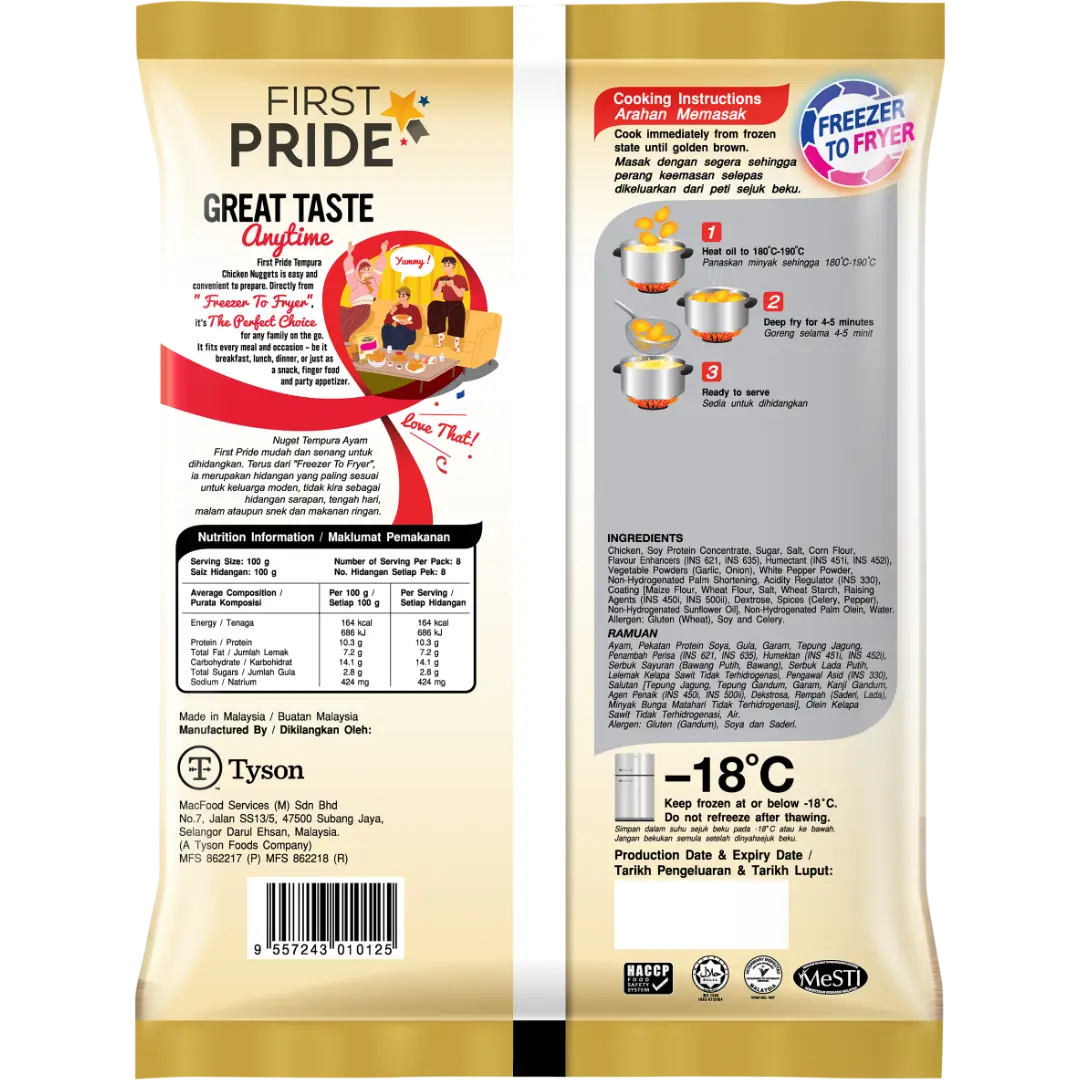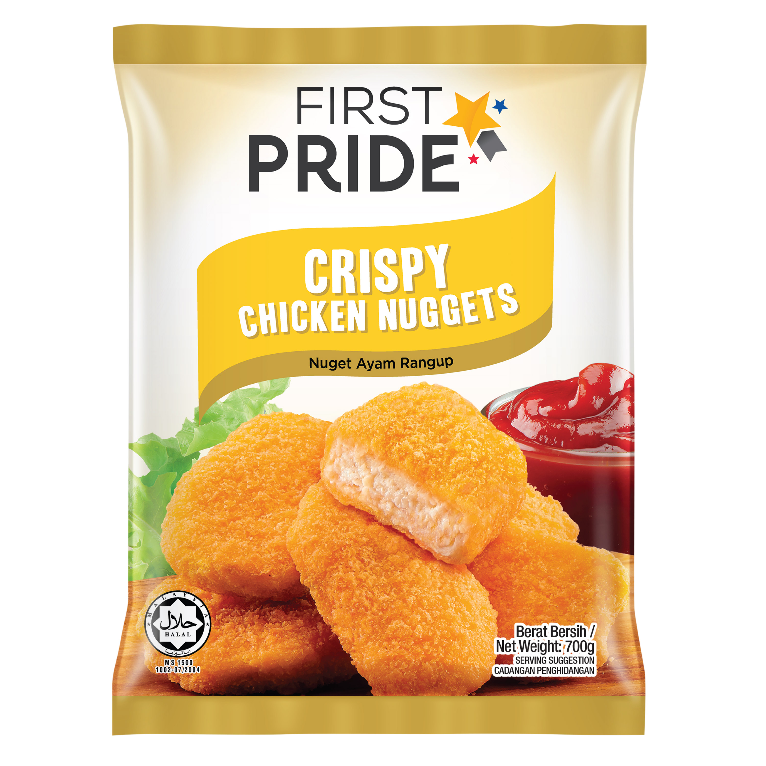 Nuget Tempura Ayam FIRST PRIDE diperbuat daripada ayam perap premium dan adunan tempura yang ringan dan rangup. Setiap gigitan menawarkan rasa kelazatan dan kerangupan yang pasti memikat selera anda. Pilihan yang sesuai untuk sebarang hidangan, nugget ini adalah yang terbaik untuk pencinta nuget ayam!